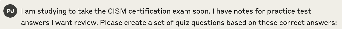 I did that in the Claude web app and it worked well. Then I wanted to expand out from there, see if Claude could generate its own set of practice questions from across the domains covered in CISM, with no notes from me. And I wanted to to refresh my memory on whether Claude could do this on its mobile app. The answer to that second part is “absolutely” on its Android app, and the new quizzes generated from all the CISM domains are excellent.