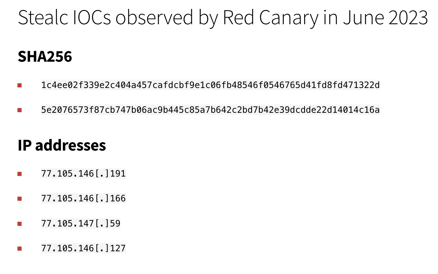 The Red Canary Intelligence Insights report for July 2023 includes this section on IoCs for a recently trending information stealing attack: