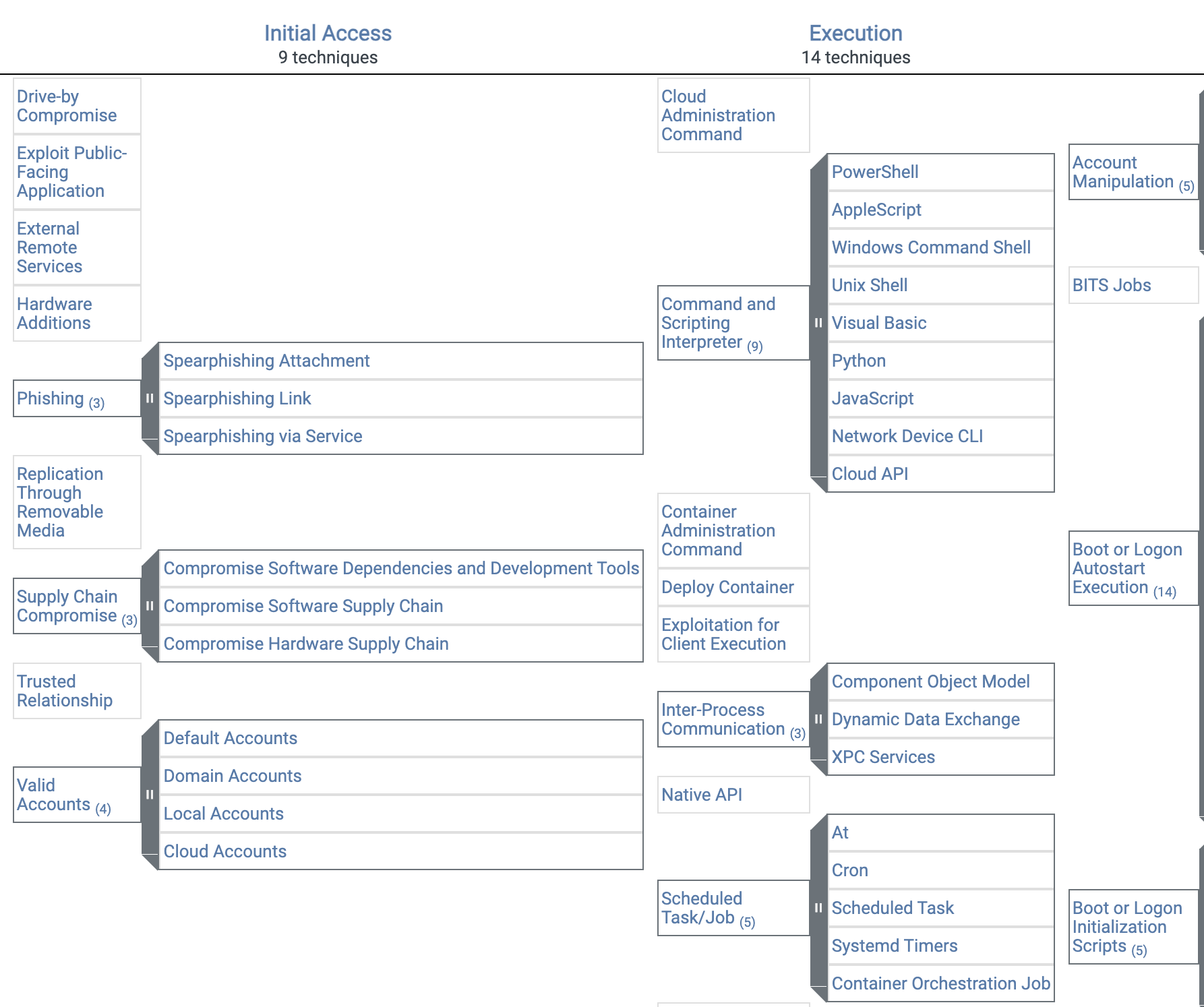 Below is a look at some of the techniques and sub-techniques used in the Initial Access and Execution phases of attacks, where we can see the heavy use of phishing to gain initial access to a target environment. We also see the use of some built-in components of Windows (PowerShell, the Windows command shell, and Scheduled Tasks) under the Execution tactic. These are stealthy, living off the land, techniques.