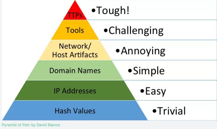 Understanding these, threat modeling and building our defenses against them, makes life significantly harder for attackers. This is perfectly illustrated in the Cyber Pyramid of Pain, from David J. Bianco.