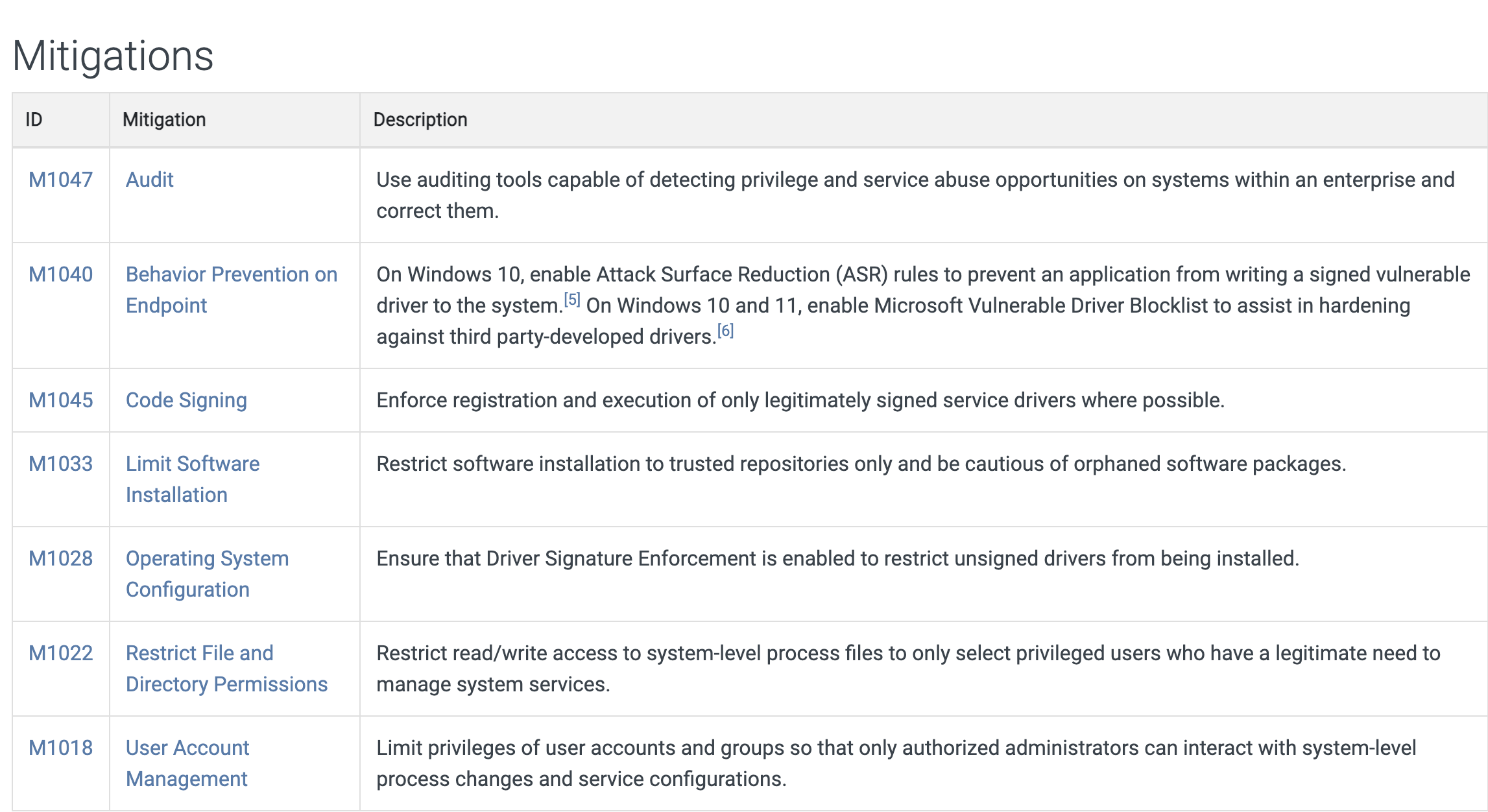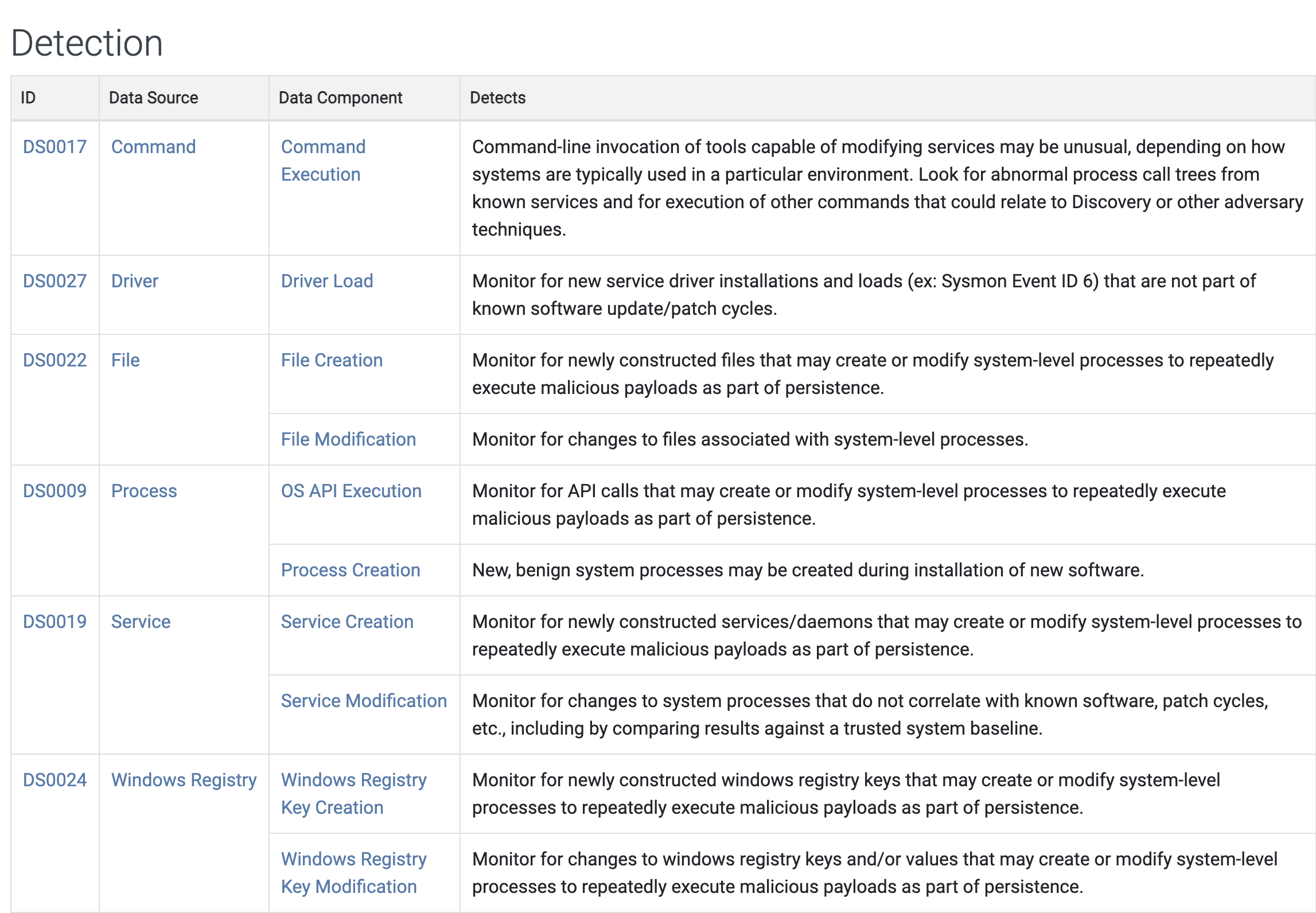 ATT&CK offers a wealth of guidance on how to detect and (in many cases) mitigate attack techniques. If we look at the Create or Modify System Process technique used in Persistence and Privilege Escalation tactics (because system processes run with elevated privileges), ATT&CK shows us 6 ways to detect these efforts and 7 recommended mitigations: