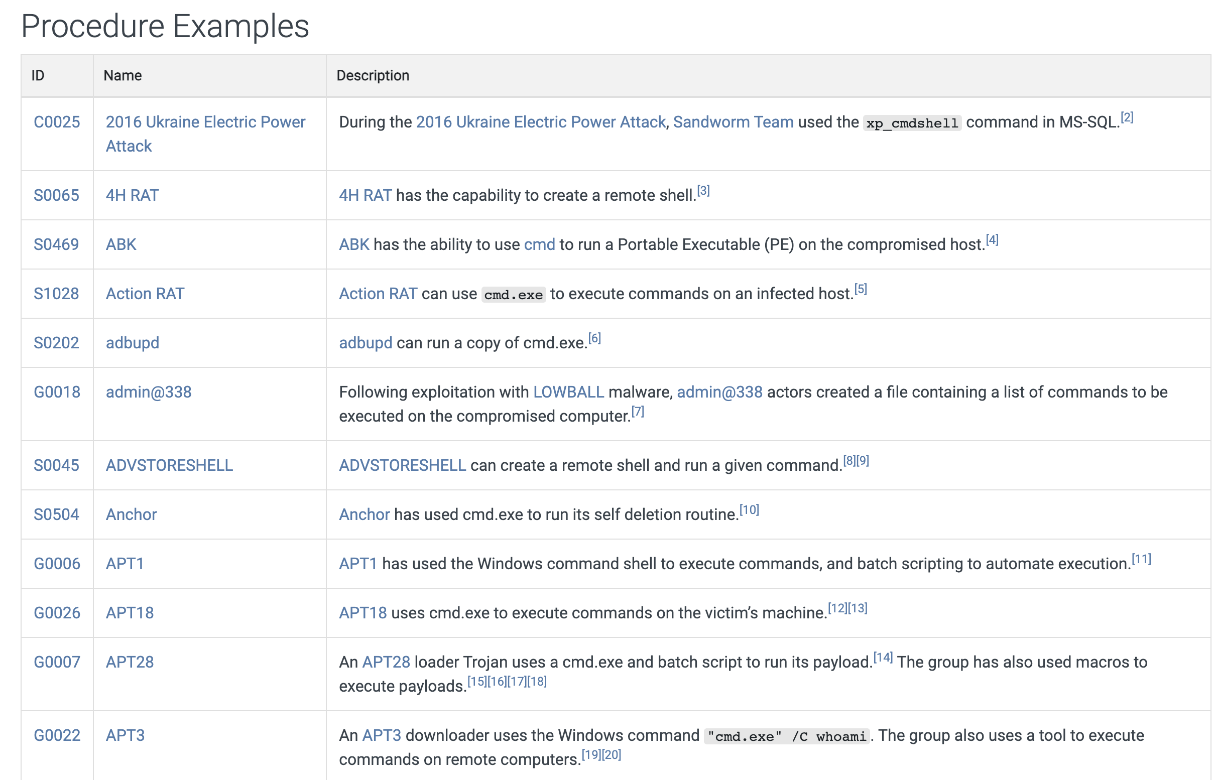 Drilling down further, here are some of the procedures used in the Windows command shell (the command line interface we get when we run CMD on a Windows machine):